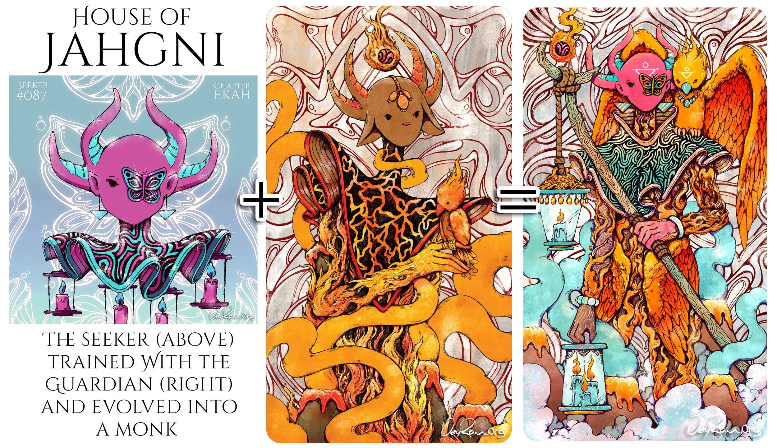 One of the main mechanics in this NFT art project is that collectors impact which characters evolve based on which pieces they collect together. Below is an example of how the Seeker evolved into a Monk.